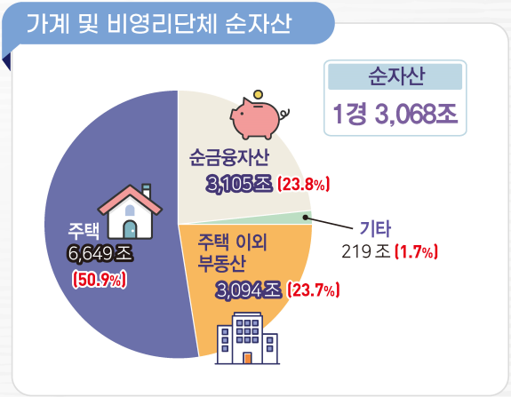 눈에 띄는 점은 자산의 절반 이상이 ‘집 한 채'라는 사실로 여전히 대한민국 가계 자산의 중심은 부동산에 집중되어 있습니다.